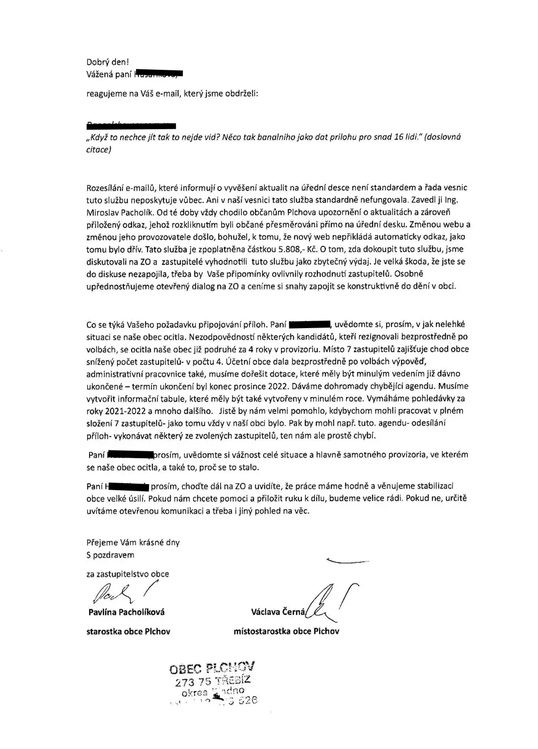 dne 11.10.2023 při jednání ZO Plchov nám bylo usnesením přijatým stávajícími zastupiteli znemožněno živé vysílání a nahrávání průběhu ZO.
