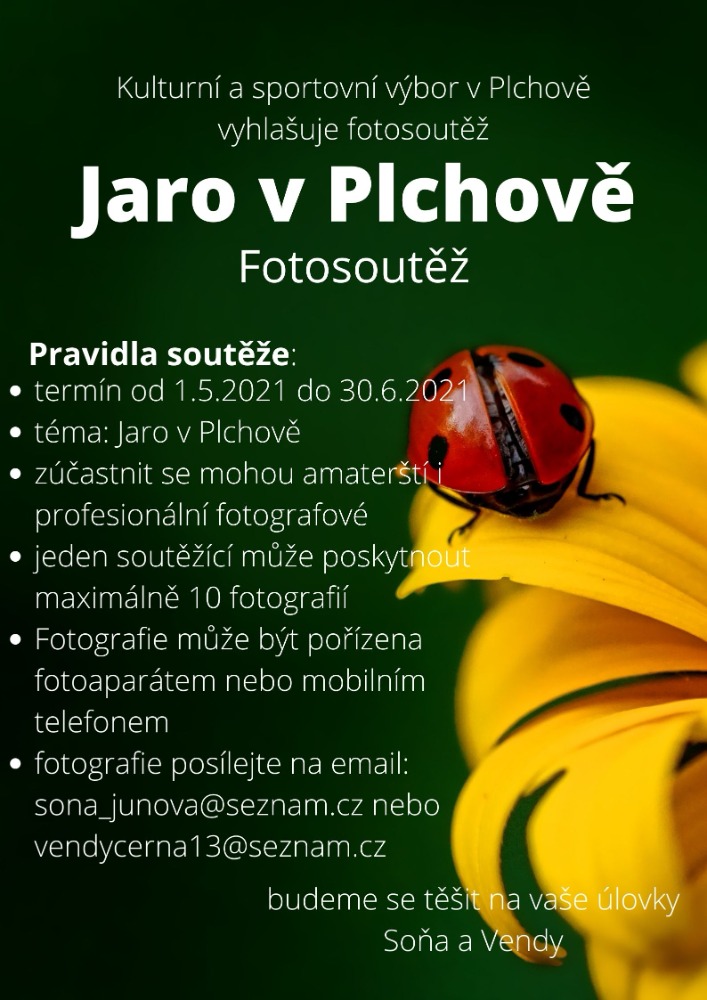 Sportovní a kulturní výbor vyhlašuje fotografickou soutěž Jaro v Plchově. Až vyjdete na procházky po okolí, nezapomeňte si vzít s sebou foťák a udělat pár foteček…Rády bychom v Plchově uspořádaly z těchto fotografií malou výstavu… Fotografie můžete zasílat na mailové adresy uvedené na plakátku. Budeme se těšit!